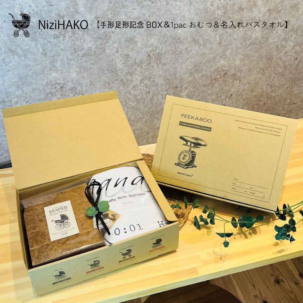【NIZIHAKO】ニジハコ オムツケーキ と 名入れ バスタオル が入った 手形足形 記念BOX すぐに使える汚れないインクセット 出産祝いや記念品に