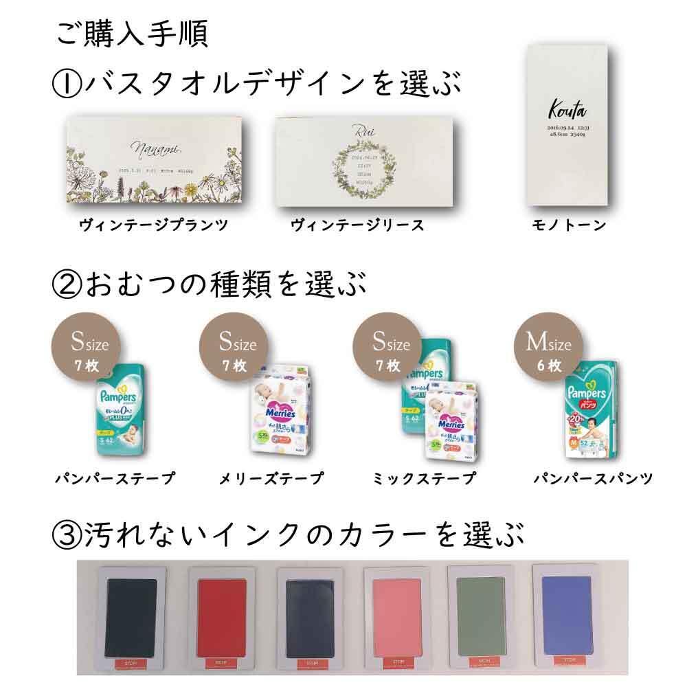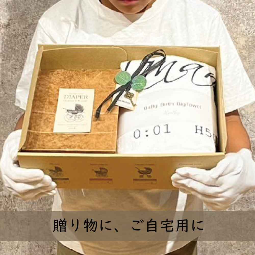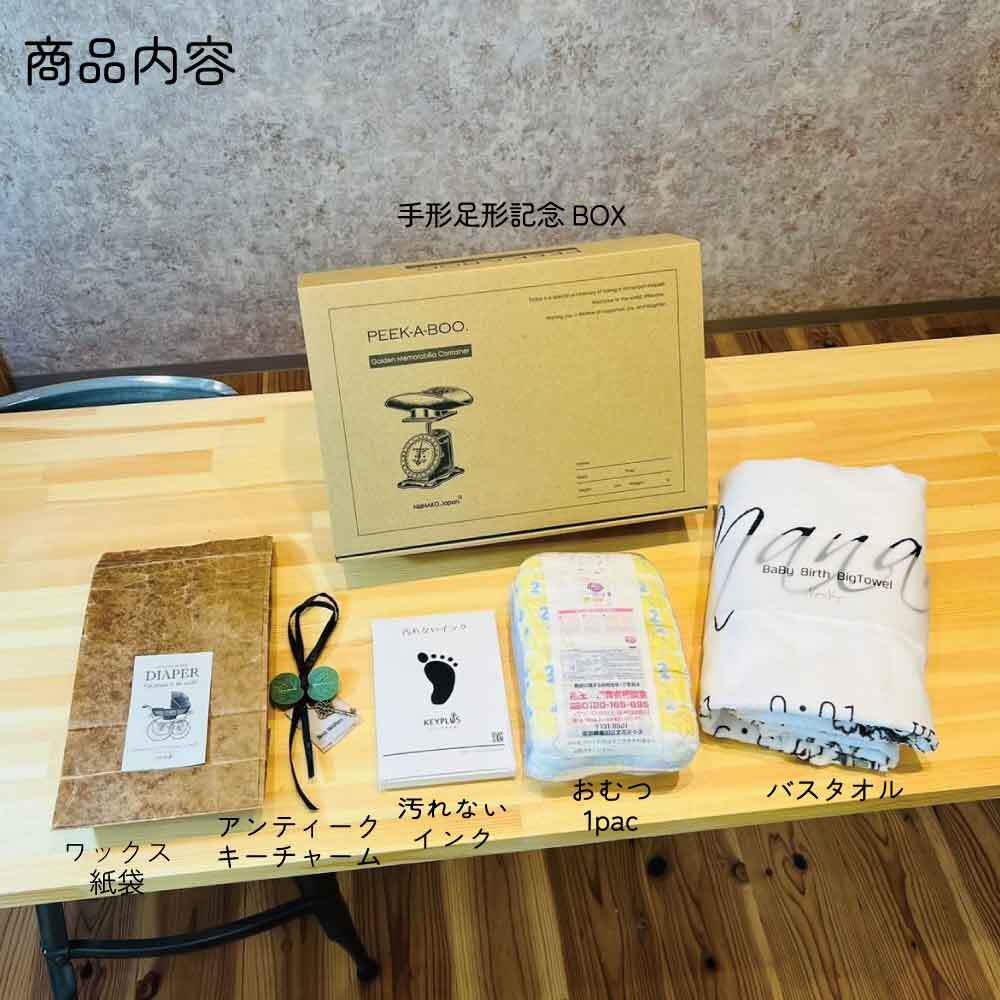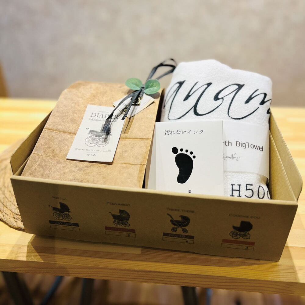 ニジハコのオムツケーキと名入れバスタオルがセットになった手形足形記念BOXです!
